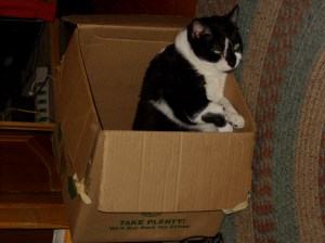 Klyban playing inside a cardboard box